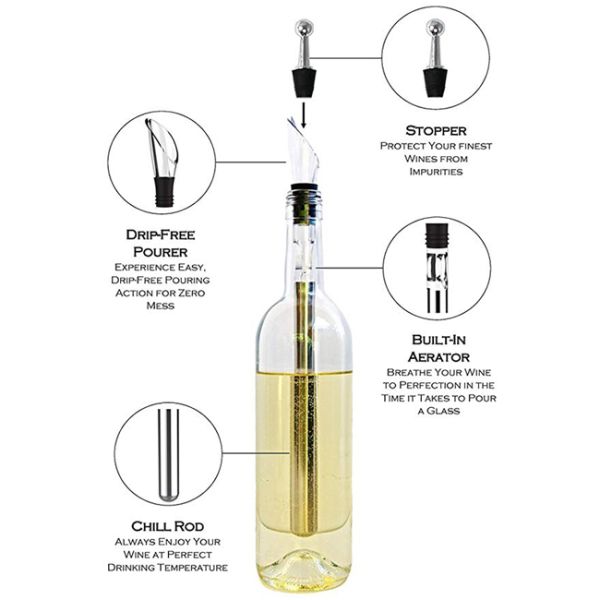 1 x wine chiller stick 1 x wine pourer aerator 1 x little stopper 1 x gift box |